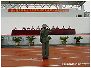 10月28日下午,学院2005年学生军训汇报大会在田径场隆重召开。学院党委书记童学敏、院长李曙明、党委副书记潘素芳、副院长周文根、副院长卢显林、纪委书记潘新华、副院长王建华,武警杭州指挥学校副政委熊品万、教保科科长陶永枫、财务科科长王志成、军训团团长周军出席了汇报大会,大会由学生处处长许兴苗主持。